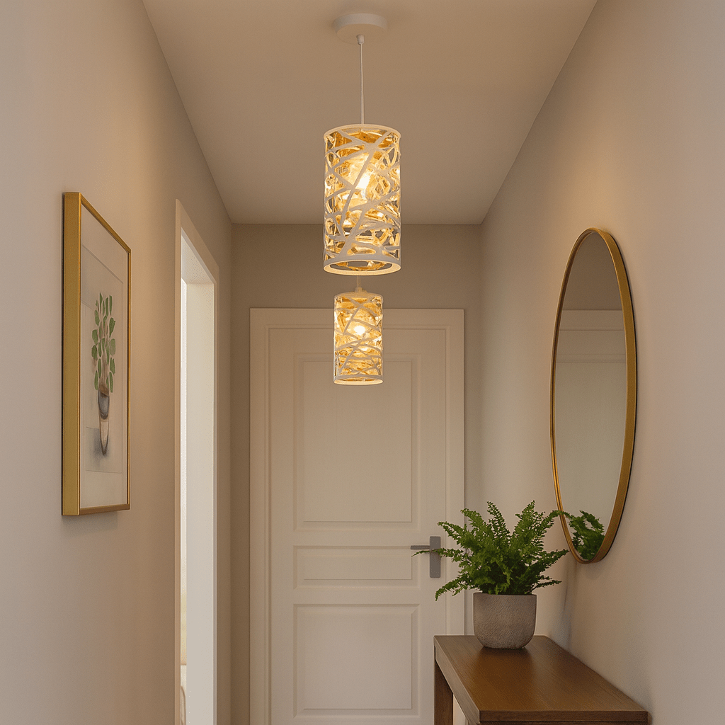 Add a refined touch of modern luxury to your space with this compact metal pendant light featuring a matt white exterior and elegant gold inner frame. Its minimalist form and warm golden glow make it perfect for smaller areas or as part of a pendant cluster.