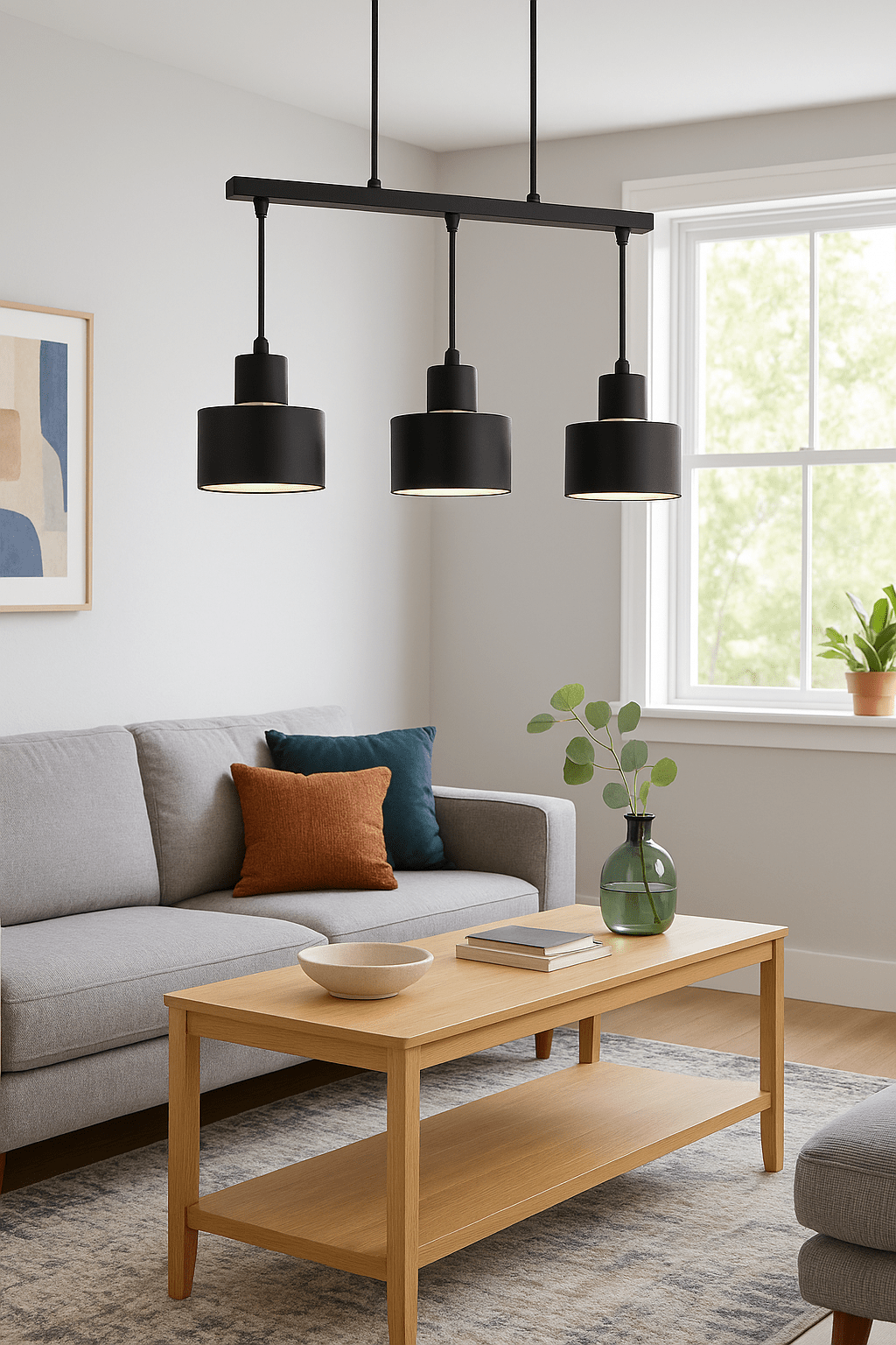Use multiple pendants in a cluster to highlight a seating area, offering layered light and elevating your living room’s contemporary style.
