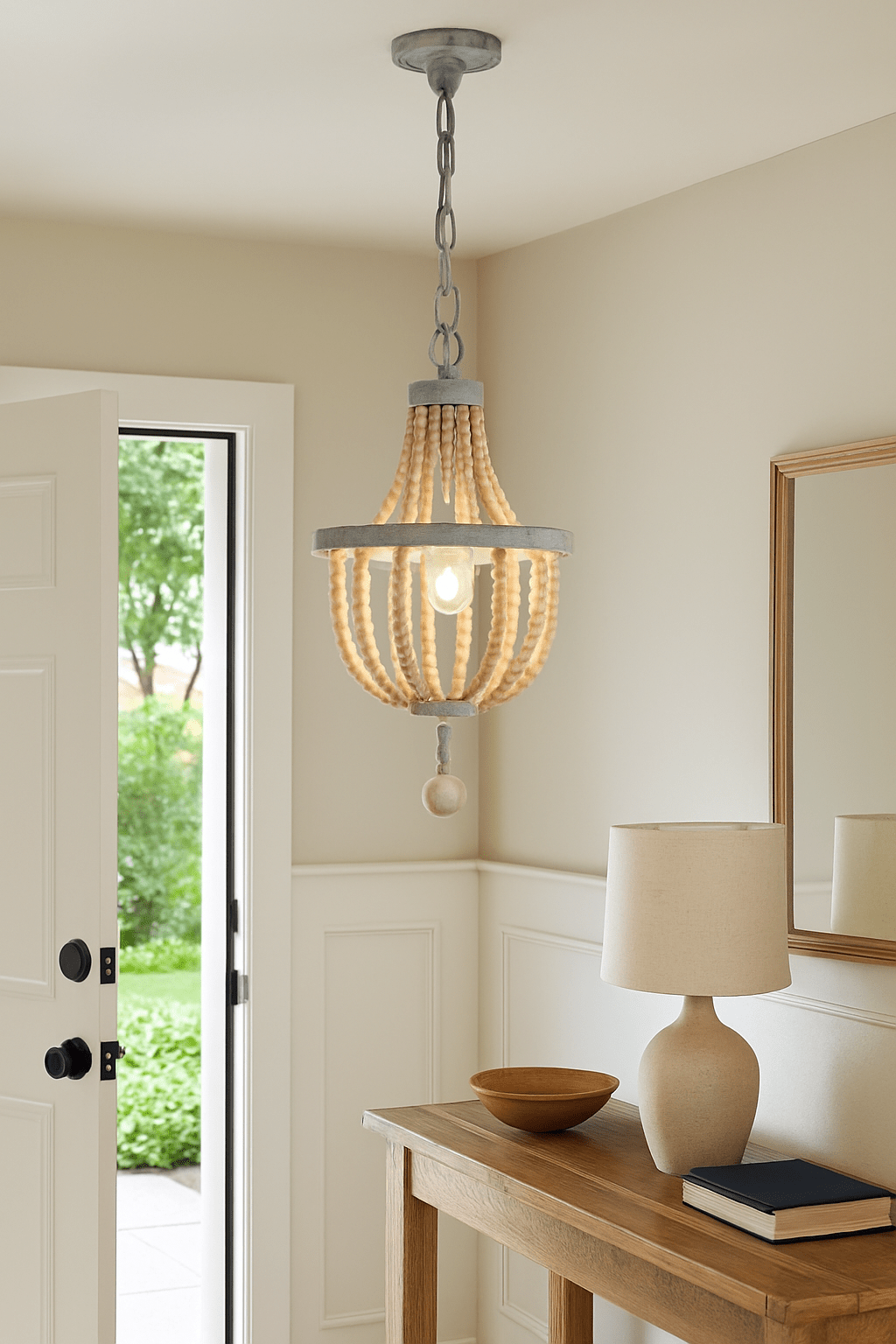 Hang in your foyer to greet guests with a sophisticated blend of wood beads and soft illumination.