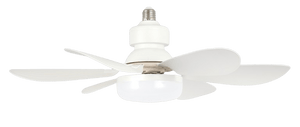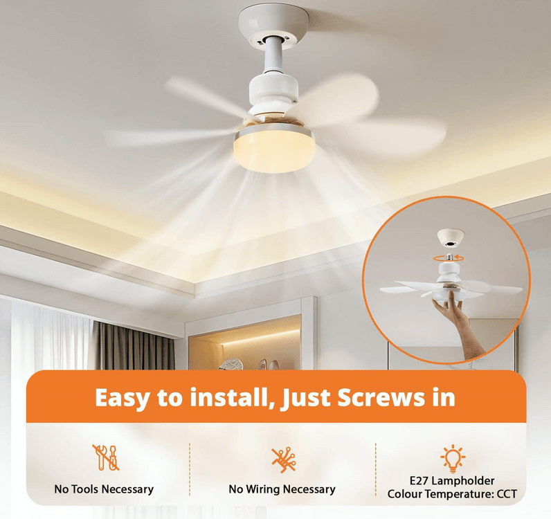 Transform your standard down-facing E27 screw-in light fitting into a fan with the new Mini Plastic Ceiling Fan. This fan not only provides a cool breeze but also has a dimmable and color-controllable 18W light.