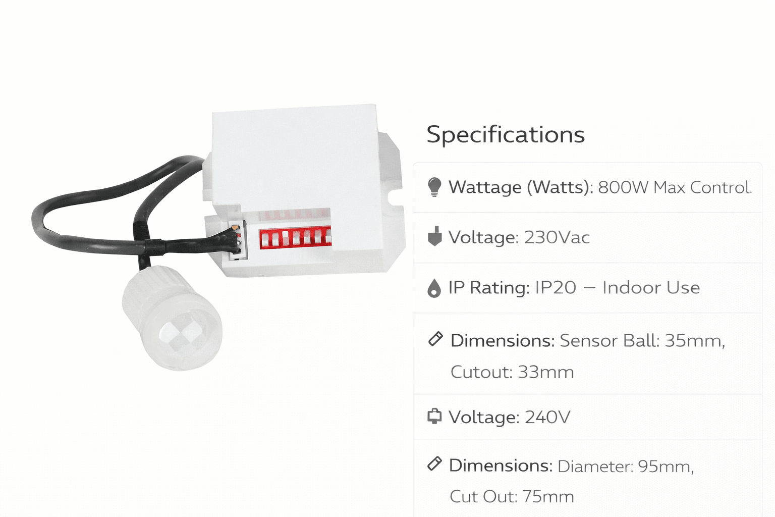 - Dimensions: Sensor Ball: 35mm, Cutout: 33mm