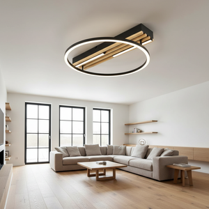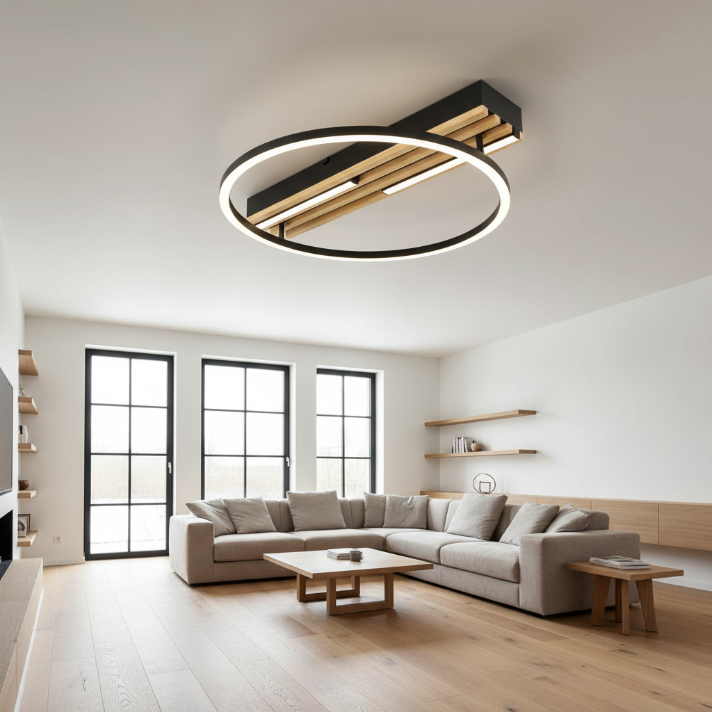 This modern LED ceiling fitting combines a sleek circular ring with a linear base detail, creating a bold yet balanced architectural look. The mix of metal construction and PVC diffuser delivers clean, even illumination, making it ideal for contemporary living rooms, bedrooms, entrances, and offices.