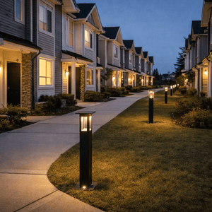 Light townhouse complex walkways: Space units evenly between blocks to create consistent visibility for residents without trenching or running mains wiring.