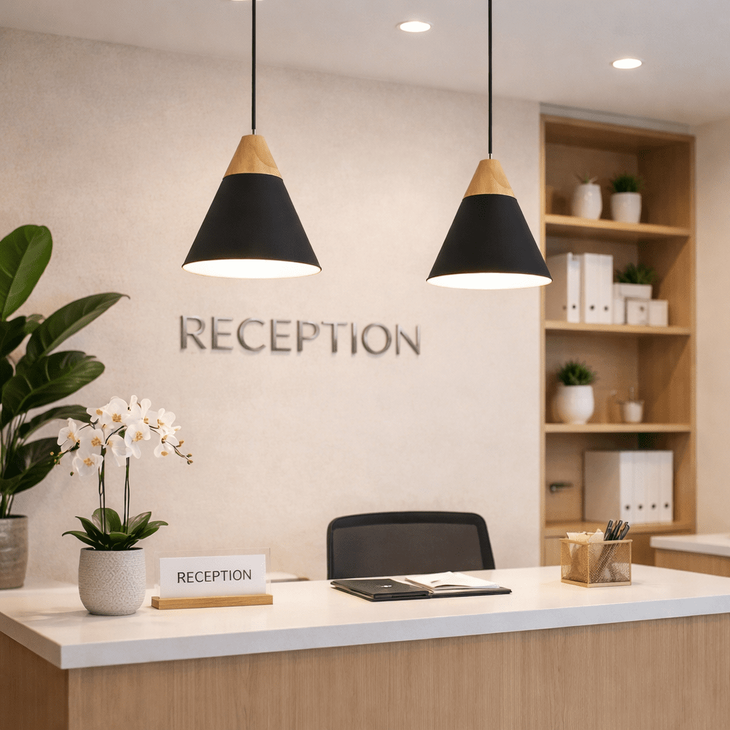 Reception desk welcome light: Hang two pendants over a reception desk to highlight the work surface and provide a welcoming first impression for visitors.