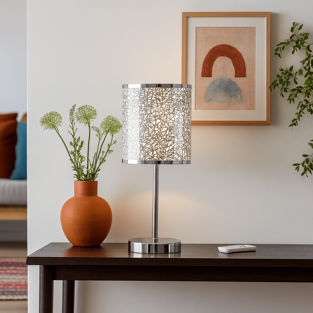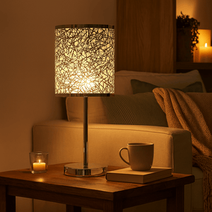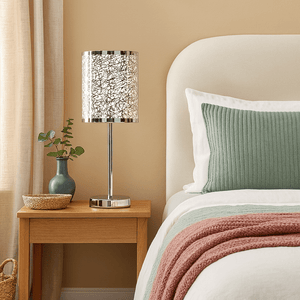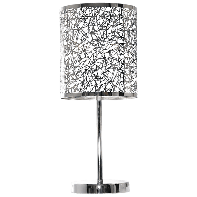 This polished chrome table lamp is a modern addition to any home, with its silver patterned shade providing gentle lighting but a strong presence. The metallic design gives it an eye-catching finish, allowing for a stylish and functional light source in any room. Enjoy peace of mind with our 2 Year Warranty!