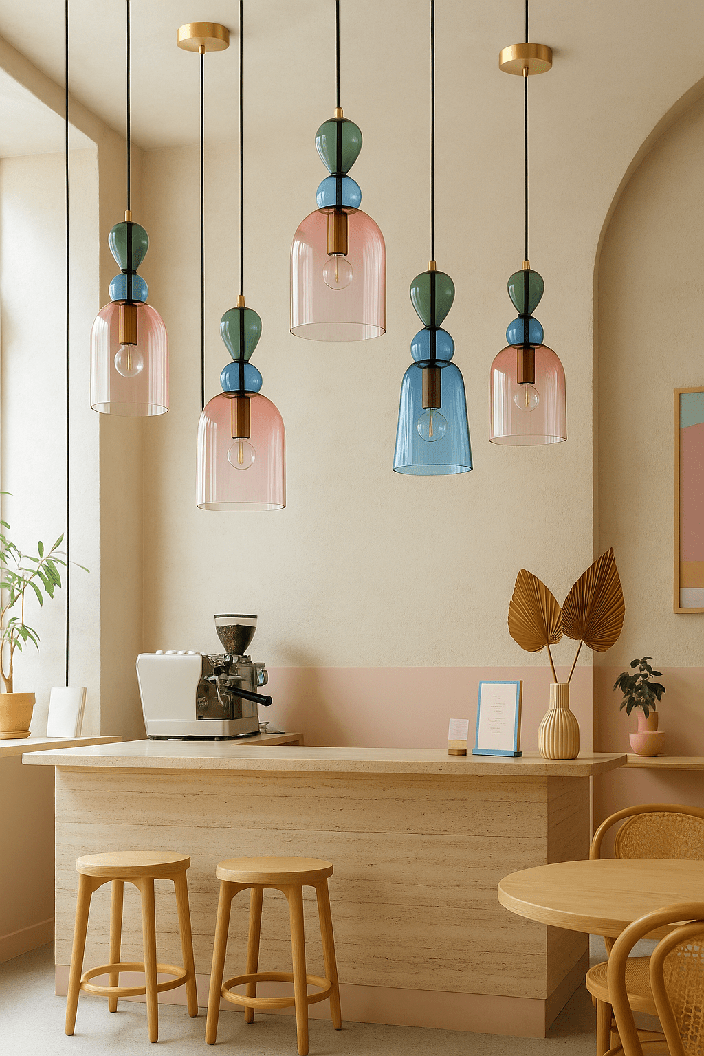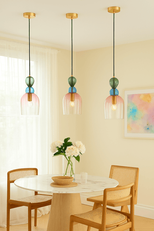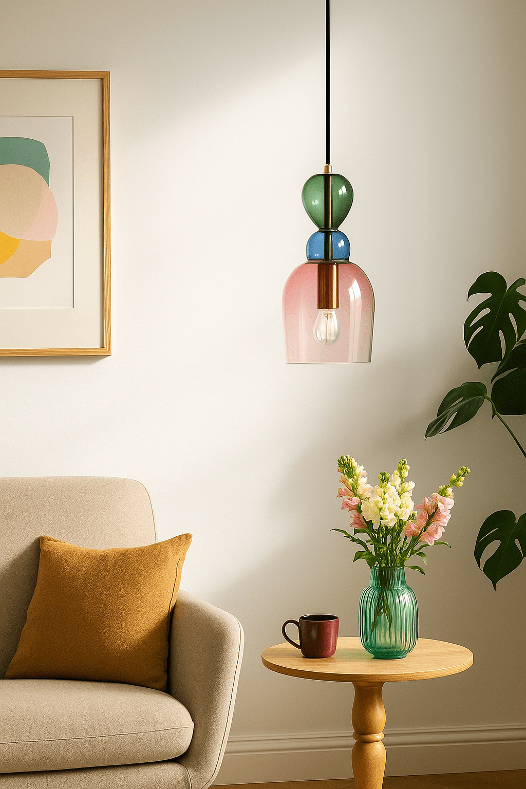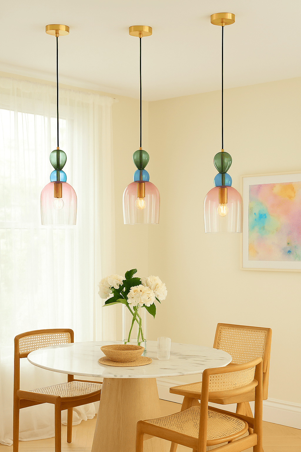 Infuse your space with colour, creativity, and European design flair. The Rainbow Pink Shadow Pendant features a stunning blend of translucent green, sky blue, and pink-tinted glass, brought together in a sculptural, stacked form. A statement piece inspired by the Euroluce Lighting Show in Milan, it transforms any room into a design destination.