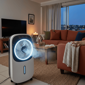 Cooling a small lounge: Place the floor fan by the sofa to refresh stale air; use mist on dry afternoons and the LED for soft light during movies.