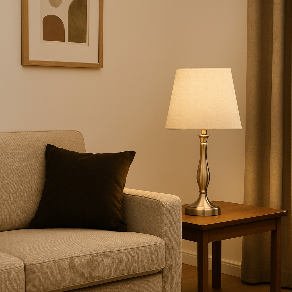 Satin Chrome, Hessian Shade Table Lamp – Elegant Illumination for Your Space