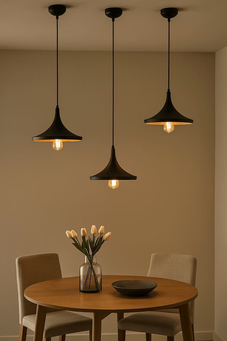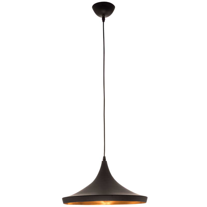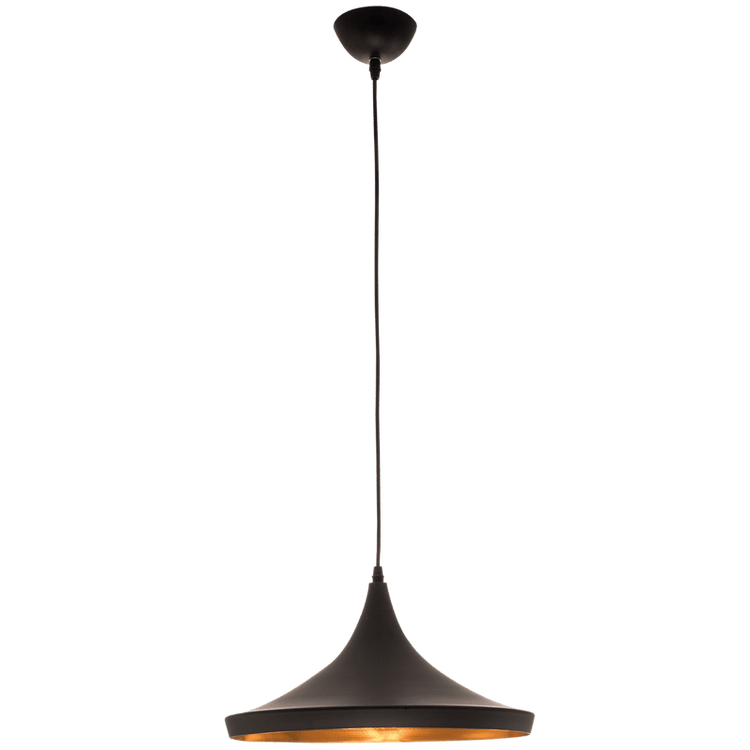 The Schwin Black & Gold Pendant Light is a striking piece designed to elevate the aesthetic of any room. With its sleek black exterior and luxurious gold inner, it offers a perfect blend of style and function, making it an ideal choice for contemporary homes or commercial spaces.