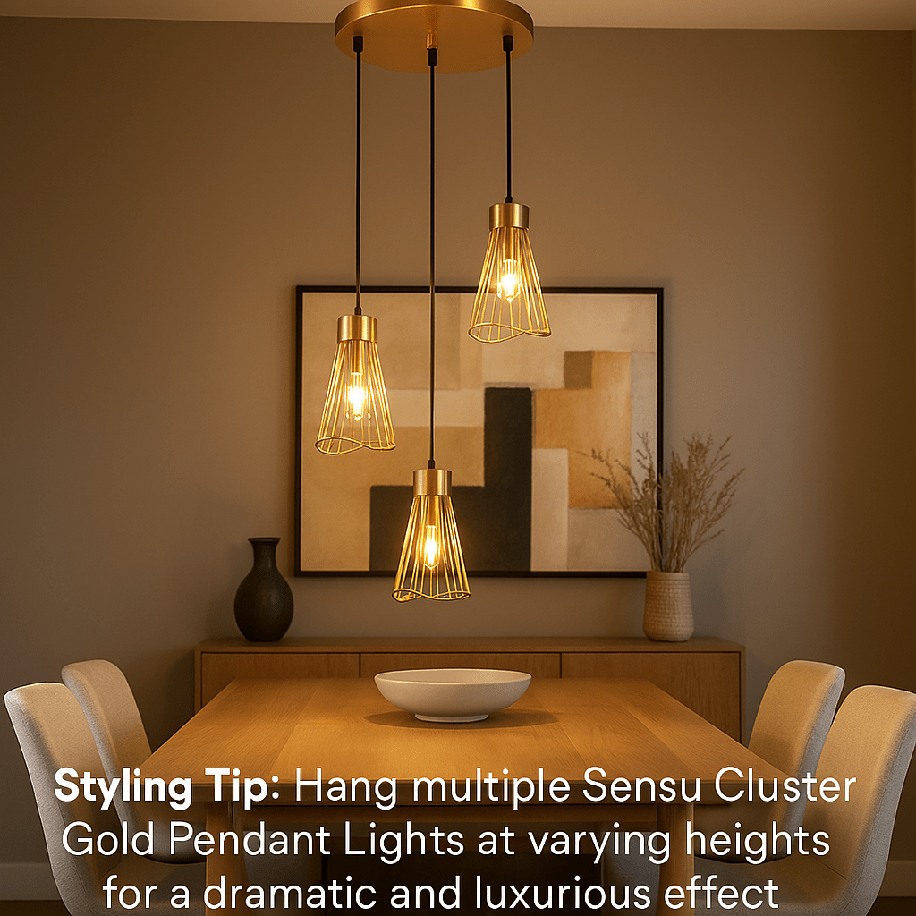 Styling Tip: Hang multiple Sensu Cluster Gold Pendant Lights at varying heights for a dramatic and luxurious effect in your dining area or foyer.