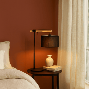 The lamp combines a metal and wood base with a fabric shade for a stylish, durable finish.