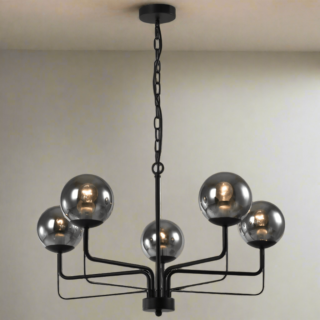 This sophisticated chandelier blends modern aesthetics with timeless elegance. Featuring a striking black metal frame and smokey glass shades, it creates a warm and inviting ambiance in any space. Whether installed over a dining table or in a living room, this statement piece enhances your décor with a sleek, contemporary touch.
