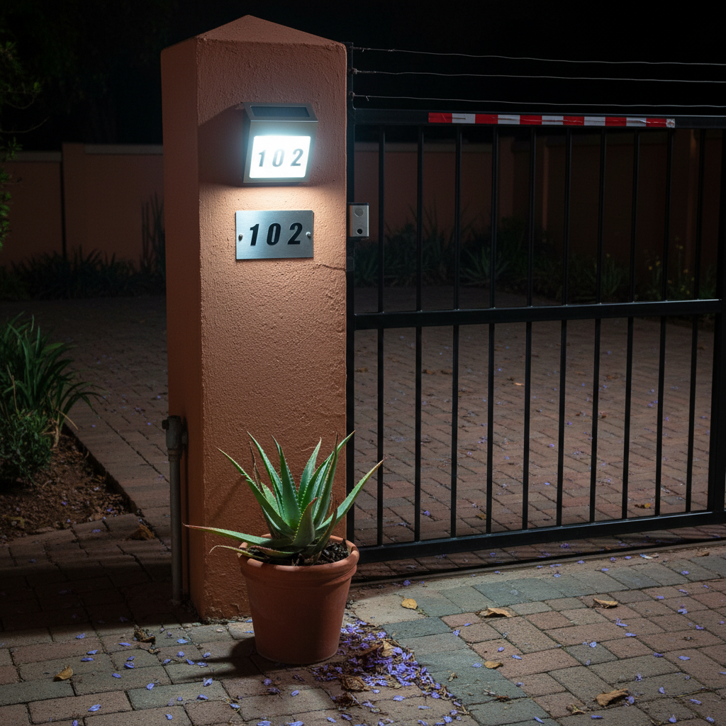 Townhouse unit entrance marker: Install beside the unit plaque so couriers and ride-hailing drivers find your door quickly after dark without disturbing neighbours.
