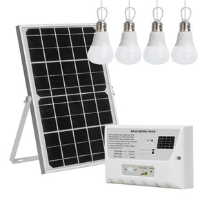 The kit includes four LED bulbs, a polycrystalline silicon solar panel with a 5 m cable, a mobile device charger, and the controller unit.