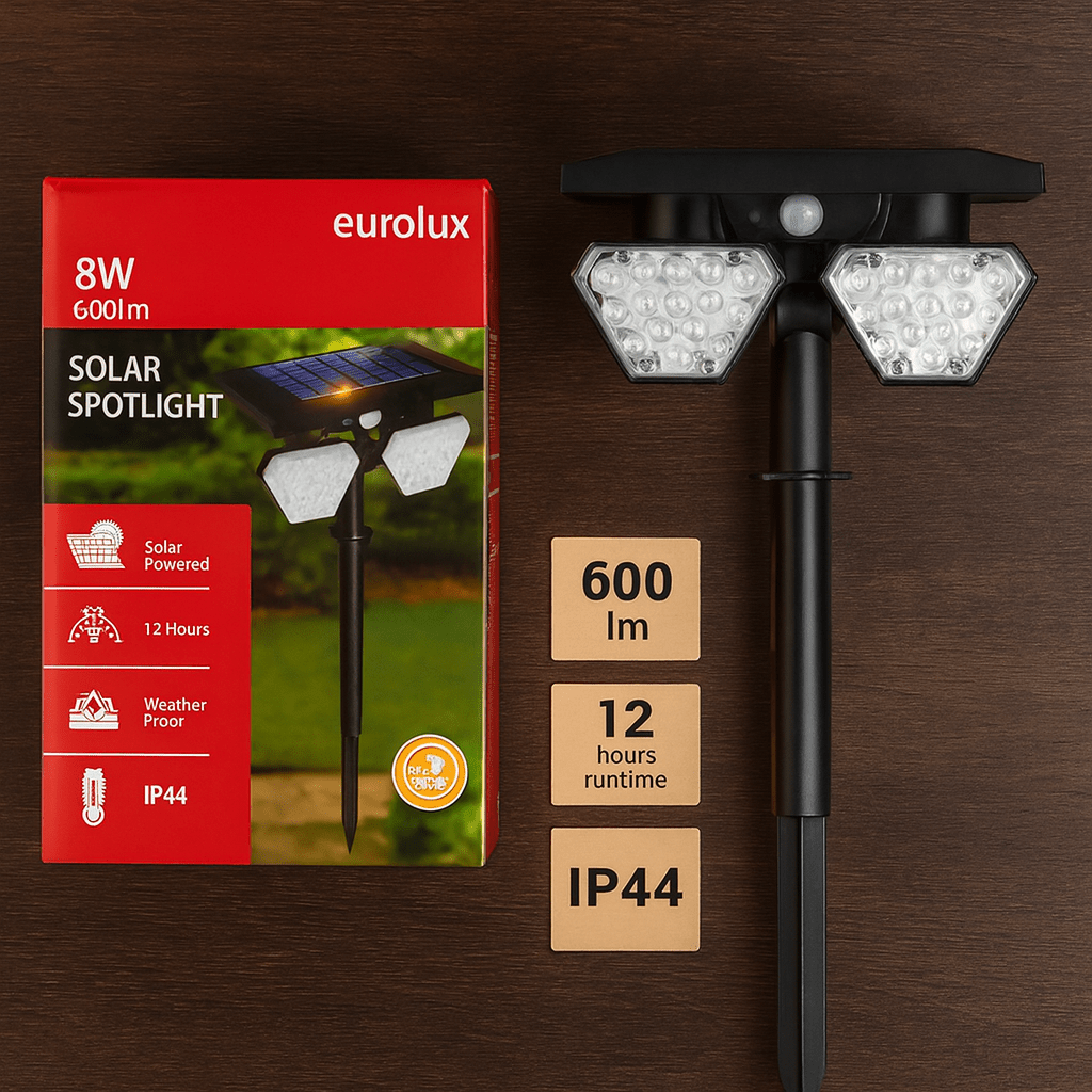 This versatile solar-powered spotlight doubles as a garden spike light or a wall-mounted spotlight, giving you flexibility in outdoor lighting design. Finished in black with a compact build, it delivers 600 lumens of crisp 6000K daylight white illumination, perfect for highlighting pathways, trees, or façades. With its built-in rechargeable battery and efficient poly-silicon solar panel, it charges in 8 hours of sunlight and provides up to 12 hours of lighting at night.
