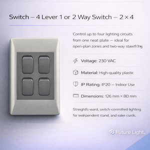 Ideal for neat, practical indoor switching, this 4-lever 1 or 2 way wall switch lets you control multiple lighting circuits from one convenient plate—especially handy for stair lighting where you may want switching from more than one point.
