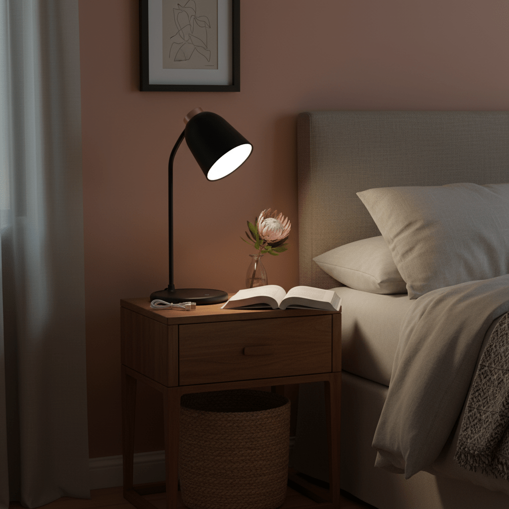 - How the product light interacts with walls, surfaces and objects: clear, neutral rendering of wood grain and print details; gentle shadow cast of objects onto the desk and floor; subtle wall wash without hotspotting.