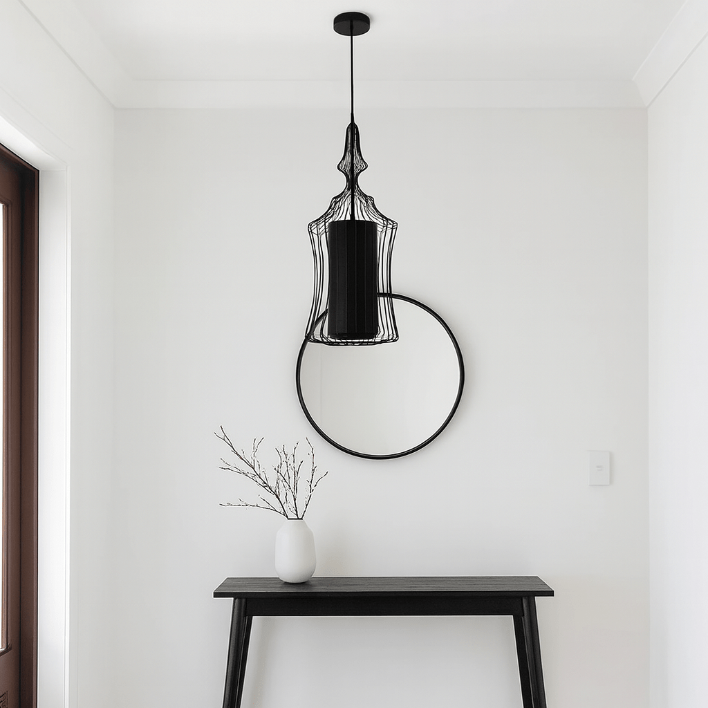 This modern wire-frame pendant is ideal for adding a stylish focal point over your dining room table, while still giving comfortable general light for everyday meals and get-togethers. The black metal frame with a fabric diffuser softens the glow, helping to create a warm, welcoming feel indoors without overpowering your décor.