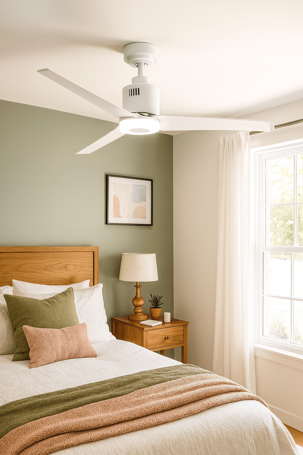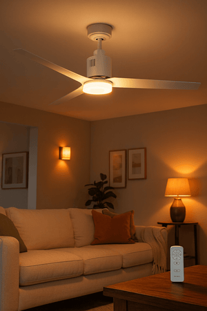 Enhance living room comfort with gentle airflow and ambient LED lighting during movie nights.