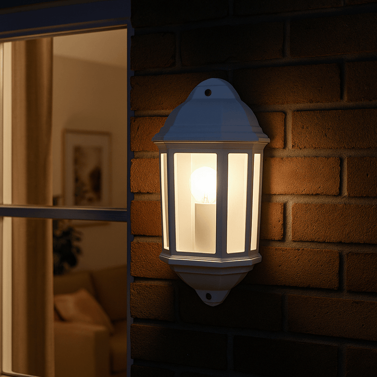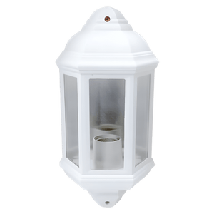This elegantly designed coastal-style outdoor wall light features a half-lantern shape, crafted from durable polypropylene with a polycarbonate diffuser. Perfect for illuminating outdoor areas like patios, entrances, and pathways, its splash-proof construction makes it a practical and attractive choice for any home exterior.